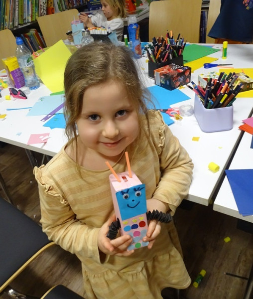 Prelegent wskazał, że choć Internet znacząco ułatwia codzienne funkcjonowanie, niesie również realne zagrożenia, takie jak uzależnienia, cyberprzemoc czy zaburzenia emocjonalne. Podkreślił rolę uważnej obecności dorosłych, budowania bliskiej więzi oraz świadomego towarzyszenia dziecku w świecie cyfrowym, aby nie zdominował on rzeczywistości. Omówił także wpływ intensywnych, szybko zmieniających się treści na najmłodszych – mogą one prowadzić do rozproszenia, niepokoju i nadmiernego pobudzenia niedojrzałego układu nerwowego. Zaznaczył, że rozwijający się mózg dziecka potrzebuje stabilnego i przewidywalnego środowiska opartego na stałych elementach oraz bezpośrednich relacjach. Równocześnie odbyły się warsztaty dla dzieci, podczas których rozmawiano o zagrożeniach pojawiających się w sieci, takich jak kontakt z nieznajomymi, dostęp do nieodpowiednich treści czy udostępnianie danych osobowych. Uczestnicy dowiedzieli się, jak bezpiecznie korzystać z Internetu – dlaczego warto tworzyć silne hasła, chronić swoje dane oraz informować dorosłych o niepokojących sytuacjach online. Na zakończenie zajęć dzieci wykonały robota – telefon komórkowy. Była to nie tylko atrakcyjna forma zabawy, ale również sposób na utrwalenie wiedzy o odpowiedzialnym i bezpiecznym korzystaniu z nowych technologii.