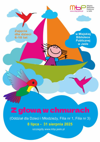 Cykl zajęć wakacyjnych Z głową w chmurach rozpocznie się od 8 lipca, a zajęcia odbywać się będą w Oddziale dla Dzieci i Młodzieży, Filii nr 1 i Filii nr 3 Miejskiej Biblioteki Publicznej w Jaśle.