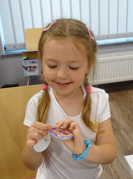 Podczas spotkania uczestnicy aktywnie dzielili się swoimi spostrzeżeniami i pytaniami na temat nieba. Rozważali, dlaczego jest ono najczęściej błękitne, oraz co decyduje o jego barwie. Dowiedzieli się, że wiosną i latem niebo jest zwykle bardziej intensywne i jasne, co związane jest z warunkami atmosferycznymi oraz kątami padania promieni słonecznych. Z kolei jesienią i zimą niebo może wyglądać na bardziej matowe i przygaszone, co wynika z różnorodnych czynników pogodowych, takich jak chmury, wilgotność czy zachmurzenie. Inspiracją do rozmów była książka Urszuli Palusińskiej pt. „Brzuchem do góry”, która z racji zbliżających się wakacji, zachęciła uczestników do myślenia o relaksie, leniuchowaniu oraz odpoczynku na łonie natury. Dzieci z dużym zaangażowaniem oglądały piękne fotografie przedstawiające krajobrazy, sceny natury i chwile pełne spokoju. Na zakończenie spotkania uczestnicy wykonali z papieru i materiałów plastycznych kolorowe przypinki, które będą im przypominały o wspólnie spędzonym czasie, o relaksie i marzeniach, a także o pięknie natury, które można dostrzec każdego dnia.