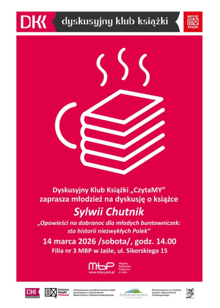 Dyskusyjny Klub Książki „CzytaMY” zaprasza młodzież na spotkanie 4 marca 2026 r. (sobota) o godz. 14:00 do Filii nr 3 Miejskiej Biblioteki Publicznej w Jaśle. Będziemy dyskutować o książce Sylwii Chutnik „Opowieści na dobranoc dla młodych buntowniczek: sto historii niezwykłych Polek”.