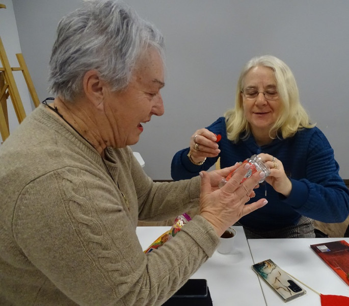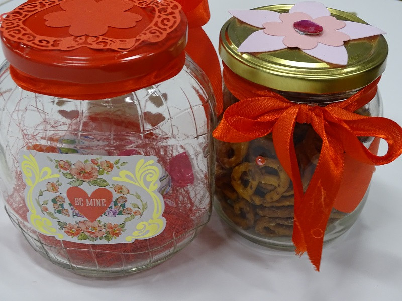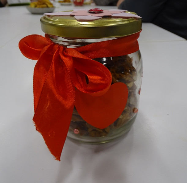 Rękodzielniczki Teresa Macek i Lidia Witkowska wspólnie z uczestniczkami ozdabiały okazjonalne słoiczki wypełnione słodyczami, a także przygotowywały filcowe poduszeczki i serca na patyku.