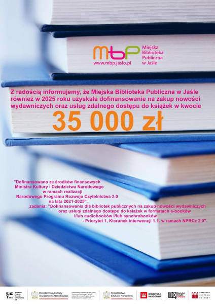 Z radością informujemy, że Miejska Biblioteka Publiczna w Jaśle również w 2025 roku uzyskała dofinansowanie na zakup nowości wydawniczych oraz usług zdalnego dostępu do książek w kwocie 35 000 zł.