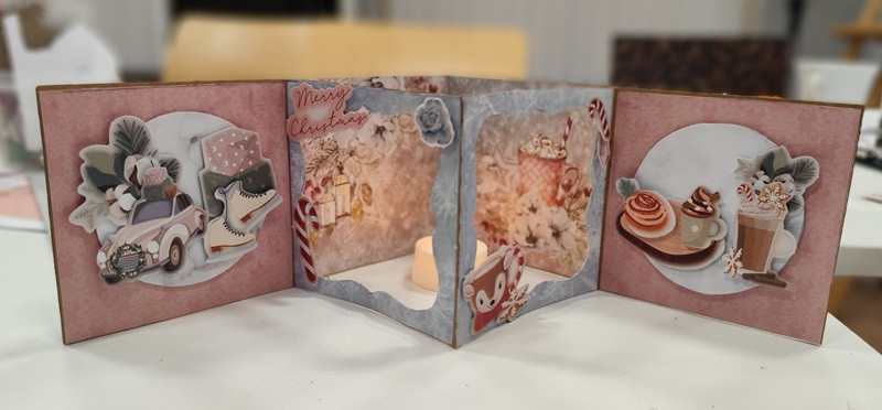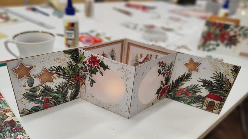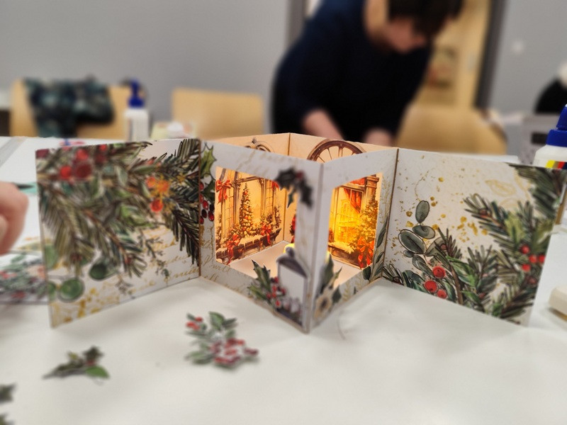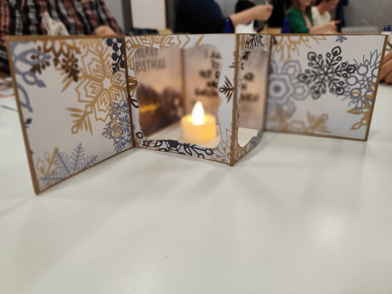 Podczas zajęć uczestnicy stworzyli wyjątkowe kartki do koperty, które po rozłożeniu mogą pełnić funkcję nastrojowego lampioniku na świeczki LED. Wszystkie materiały i narzędzia zapewnił organizator. Do dyspozycji były profesjonalne papiery, elementy do wycinania oraz rozmaite dodatki: wstążki, guziki, cekiny, suszone rośliny i drewniane scrapki, którymi uczestnicy ozdabiali swoje kompozycje.