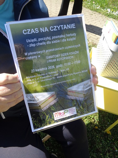 Z kolei 23 kwietnia zaprosiliśmy naszych czytelników do wzięcia udziału w akcji „Czas na czytanie”. Od godziny 11 do 12 na skwerze przed Krytą Pływalnią, a później na holu przed wejściem do biblioteki, czytaliśmy, smakowaliśmy herbatę i rozmawialiśmy na tematy różnorodne. Czytelnicy z okazji tego ważnego święta otrzymali drobne upominki: dorośli torby, a dzieci kolorowe tatuaże. Podsumowując: Czytanie to jedna z najlepszych aktywności dla mózgu, poszerza słownictwo, poprawia pamięć, koncentrację oraz rozwija empatię i wyobraźnię. Zdecydowanie warto czytać!