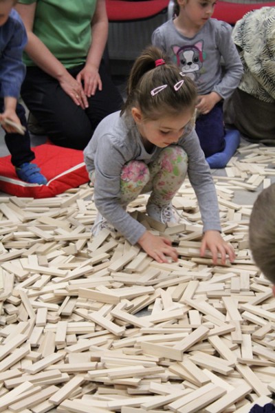 Miłośników twórczego konstruowania i spędzania wspólnie czasu zaprosiliśmy na warsztaty Hocki-klocki. Bohaterami warsztatów były…tradycyjne drewniane klocki, które posłużyły najmłodszym oraz ich dziadkom i rodzicom do tworzenie fantazyjnych budowli i zacieśniania rodzinnych więzi. Razem z wnuczką dzielnie pracujemy nad tym, żeby nasza wieża była najwyższa! – powiedziała jedna z uczestniczek. Dziecięca fantazja i międzypokoleniowa współpraca zaowocowały m.in.: „najwyższą pod słońcem wieżą”, robotem a nawet wybiegiem dla kucyków. Będę budował piętrowce, roboty, samoloty i będę w Bibliotece całą noc! – komentował zabawę Igor.
