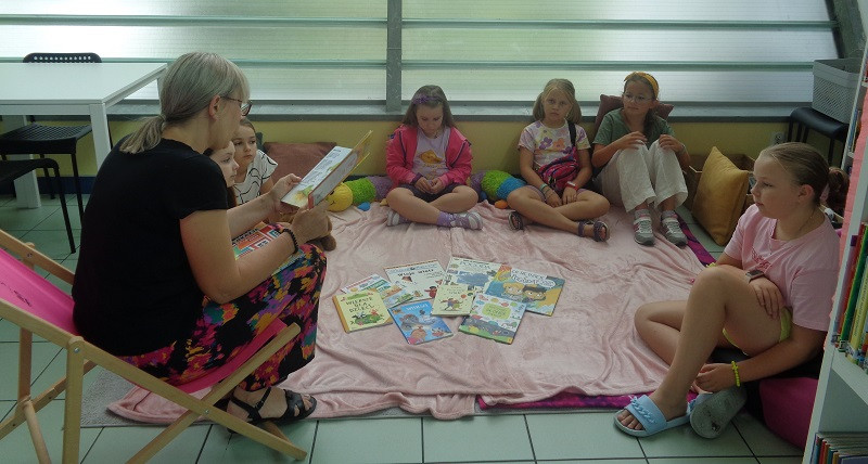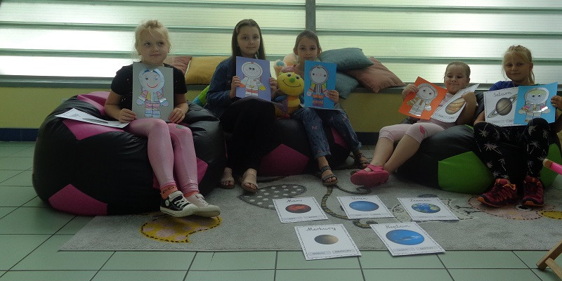 Odkryliśmy tajemnice kosmosu, planet i wyruszyliśmy z pierwszymi ludźmi na Księżyc w podróż po srebrnym globie. Dowiedzieliśmy się ciekawostek na temat tornad, gdzie występują i jaką maja moc. Atrakcją było wykonanie eksperymentu „Tornado w słoiku”. Z papieru stworzyliśmy Pana i Panią Chmurkę. Zastanawialiśmy się „Skąd się bierze wiatr”, jaki ma wpływ na przyrodę i człowieka, bawiliśmy się w pogodowe skojarzenia, szukaliśmy skarbów ukrytych na końcu tęczy, którą sami stworzyliśmy. Dużo czytaliśmy: wierszy o pogodzie, klimacie, a także przeglądaliśmy książki dotyczące tych tematów dostępne w bibliotece, tj.: „Co się dzieje z pogodą” L. Ertimo, „ Z dużej chmury mały deszcz” A. Nożyńska-Demianiuk, „Po co wieje wiatr” R. Witek, „Wiersze dla dzieci” J. Tuwim, „Najpiękniejsze baśnie, bajki i legendy” M. Kwietniewska-Talarczyk. Na zakończenie wakacji, korzystając z pięknej pogody, zorganizowaliśmy piknik na zewnątrz biblioteki w cieniu dużego drzewa.