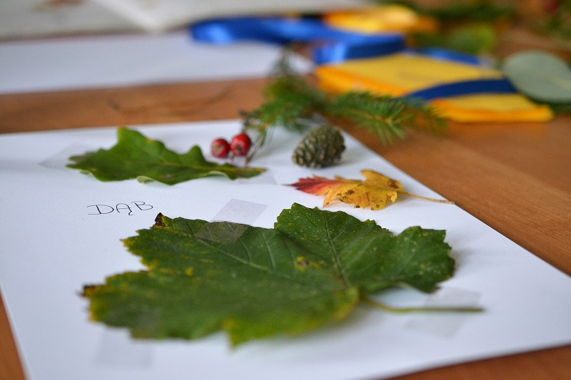 Tego samego dnia odbyły się warsztaty literacko-ekologiczne, na których wykonaliśmy leśne zielniki ze skarbów przyniesionych ze spaceru. Zabrane przez nas książki z małej przyrodniczej biblioteczki, okazały się bardzo pomocne w ich tworzeniu i pogłębieniu wiedzy o znajomość gatunków drzew.