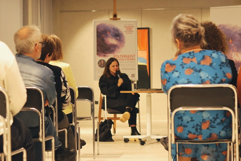 Rozmowa toczyła się wokół tomiku „Poltergeist” (2024), który jest osadzony właśnie w takich klimatach. Honek znakomicie potrafi pokazać dramat bohaterki zmagającej się ze stratą kogoś bliskiego. Proste codzienne sytuacje, powtarzalność (także rytm przyrody), zachody i wschody słońca – stają się nośnikami uniwersalnych emocji. Tu też bohaterką jest bolesna pamięć i uczucia z jakimi się mierzy. Poetka pokazuje różne etapy przeżywania żałoby (zaprzeczenie, złość, akceptacja), a następnie powracanie wspomnień. Oddaje amplitudę odczuć – od strachu po pragnienie, aby tę osobę zobaczyć. Poezja Honek wywołuje ciarki w odbiorcach i w niej samej. Poetka przyznała, że potrzebuje od niej odpoczynku.