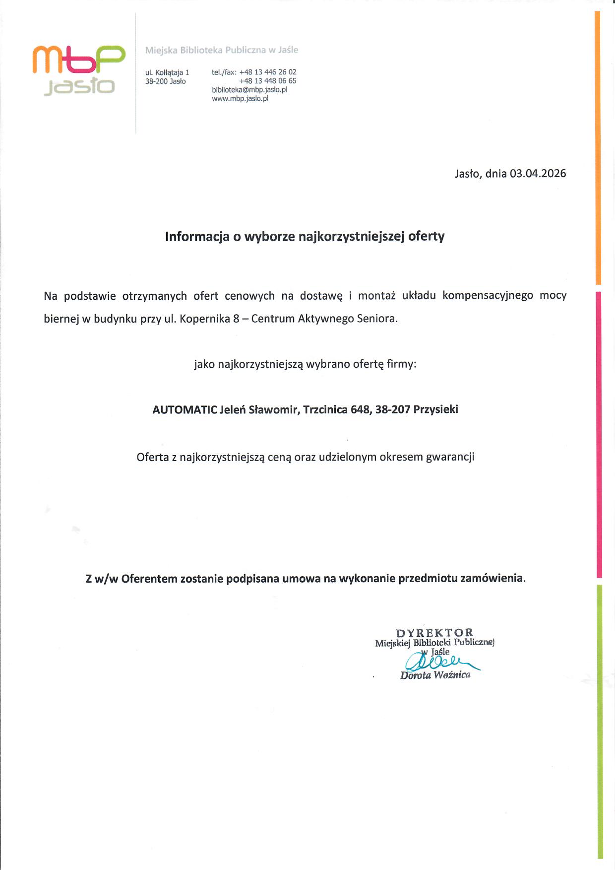 Informacja o wyborze najkorzystniejszej oferty na dostawęi montaż układu kompensacyjnego mocy biernej w budynku przy ulicy Kopernika 8