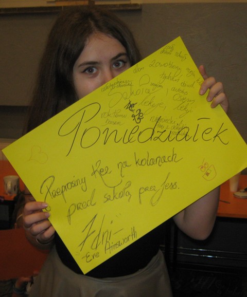 Korzystając z układu książki, bazującego na dniach tygodnia, stworzyłyśmy kolorowe plansze na każdy dzień i jednocześnie na każdy rozdział książki. Na jednej części opisałyśmy najważniejsze wydarzenia z życia Kez i Jesss, a na drugiej to, co jest dla nas ważne w tym dniu.Podczas dyskusji nasunęło się pytanie: Czy byłyście kiedyś w takiej sytuacji i co zrobiłybyście na miejscu Jess? Większość spotkała się z jakąś formą znęcania się i wyśmiewania, ale jak zauważyła jedna z klubowiczek: Nie każdy pozwoli na to, żeby go prześladować. Słowami można też walczyć.