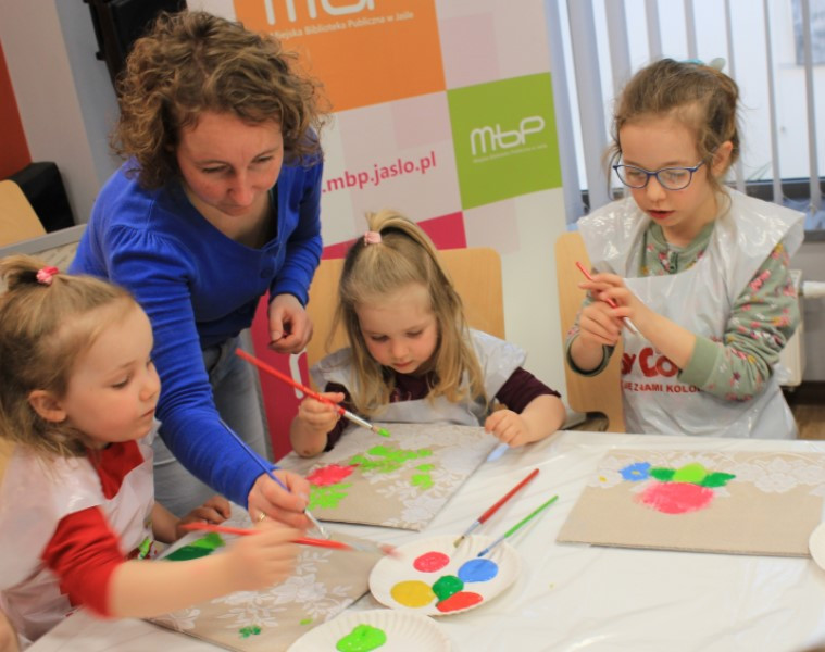24 marca w Klubie Czytujących Rodzin działającym przy Miejskiej Bibliotece Publicznej w Jaśle spotkaliśmy się, aby powitać kalendarzową wiosnę. Sprawdziliśmy kto widział jej zwiastuny, czytając wiersze i opowiadania żegnaliśmy zimę. Uczestnicy podzielili się swoimi spostrzeżeniami na temat zmian zachodzących w przyrodzie i stwierdzili, że wiosna kojarzy się im z wieloma pozytywnymi emocjami. Używając farb, firan i wiosennych humorów stworzyli galerię obrazów, która będzie im przypominać, że już czas pięknie się uśmiechać i wkroczyć w wiosnę z nową energią.