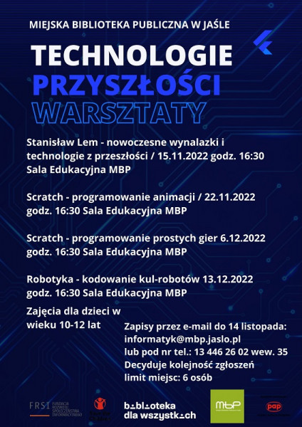 Listopad w Miejskiej Bibliotece Publicznej w Jaśle poświęcimy nowym technologiom. Będziemy czytać Stanisława Lema, wdrożymy w życie ćwiczenia praktyczne z wykorzystaniem komputerów i robotów. Obmyślimy nowe projekty, stworzymy animacje i gry komputerowe oraz zaprogramujemy roboty.