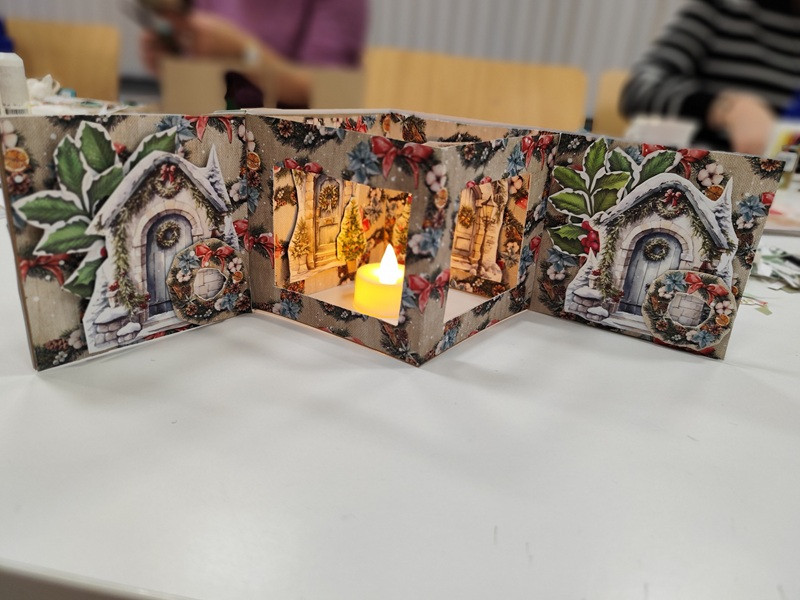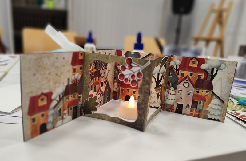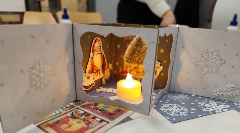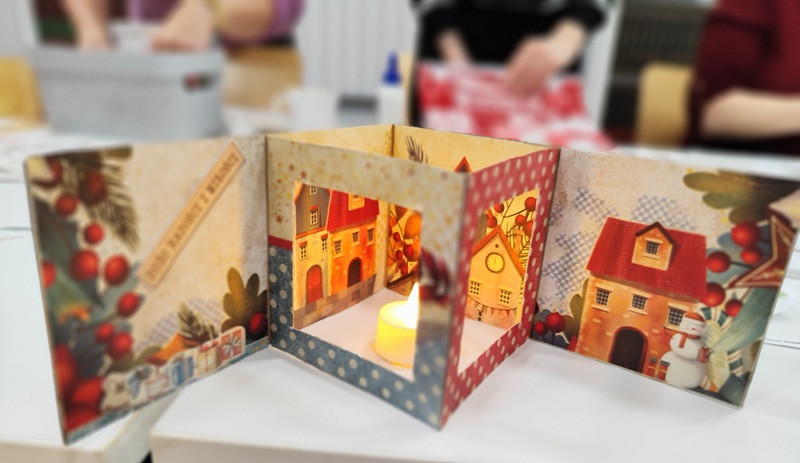 Podczas zajęć uczestnicy stworzyli wyjątkowe kartki do koperty, które po rozłożeniu mogą pełnić funkcję nastrojowego lampioniku na świeczki LED. Wszystkie materiały i narzędzia zapewnił organizator. Do dyspozycji były profesjonalne papiery, elementy do wycinania oraz rozmaite dodatki: wstążki, guziki, cekiny, suszone rośliny i drewniane scrapki, którymi uczestnicy ozdabiali swoje kompozycje.