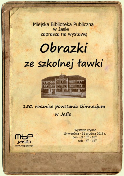 Miejska Biblioteka Publiczna w Jaśle zaprasza na wystawę „Obrazki ze szkolnej ławki”, która powstała z okazji jubileuszu 150-lecia założenia I Liceum Ogólnokształcącego w Jaśle. Na wystawie zaprezentowano pamiątkowe fotografie, zdjęcia klasowe uczniów wraz z profesorami, tableau absolwentów oraz dokumenty pochodzące m. in. ze zbiorów I Liceum Ogólnokształcącego w Jaśle, Muzeum Regionalnego w Jaśle, Miejskiej Biblioteki Publicznej w Jaśle, a także osób prywatnych.